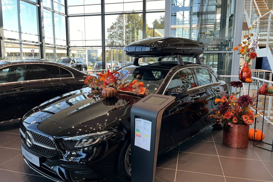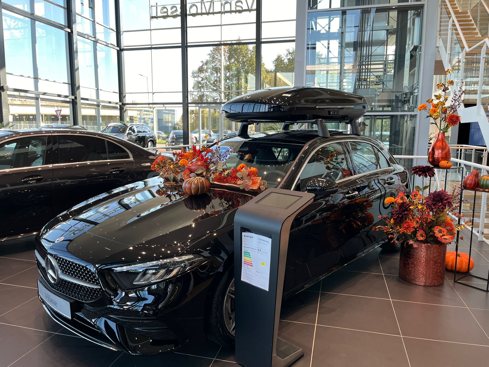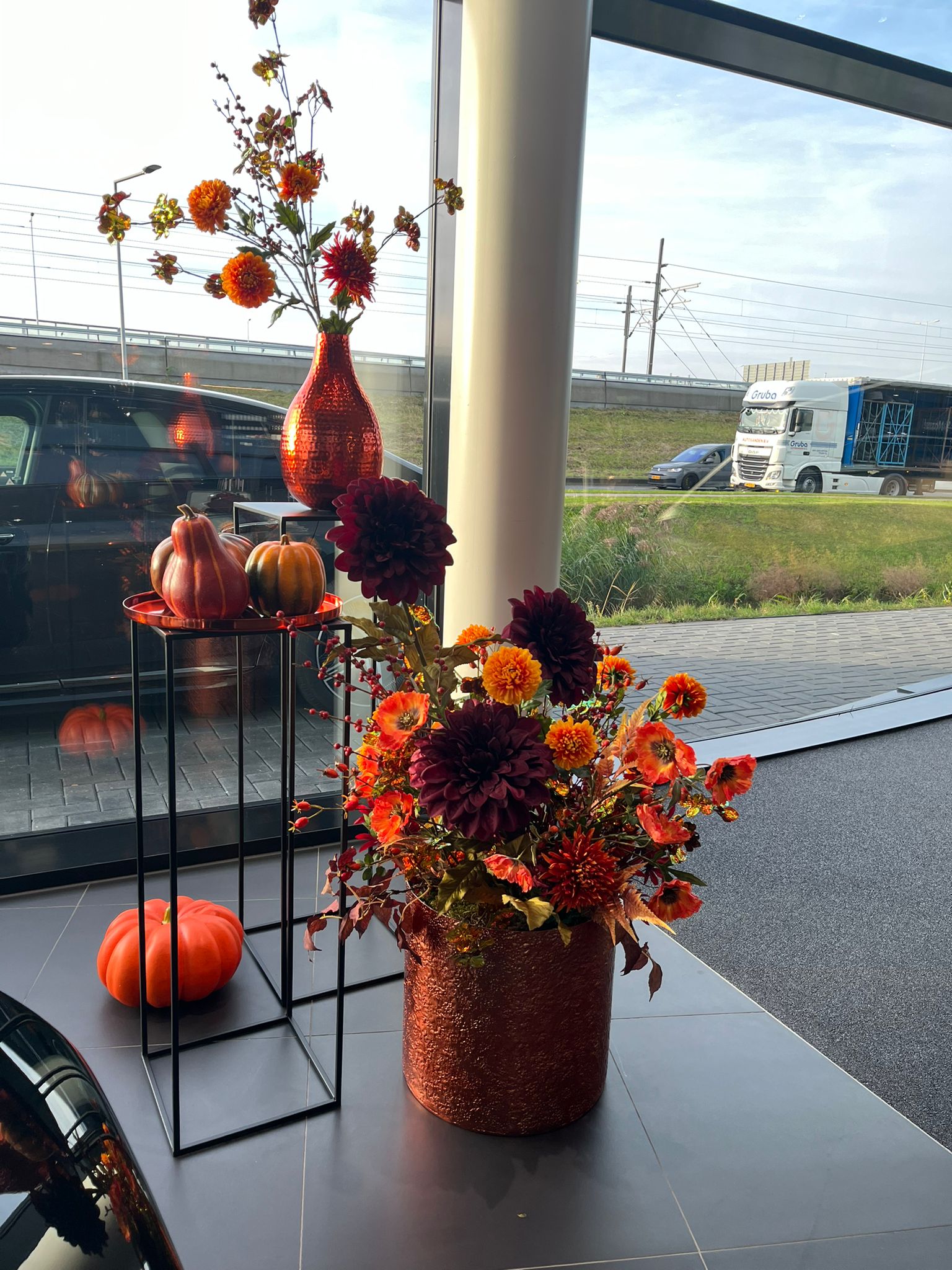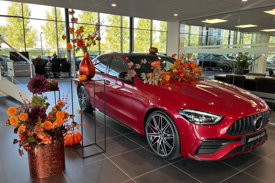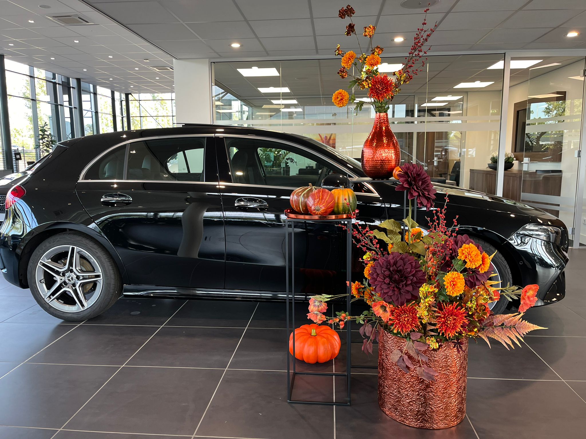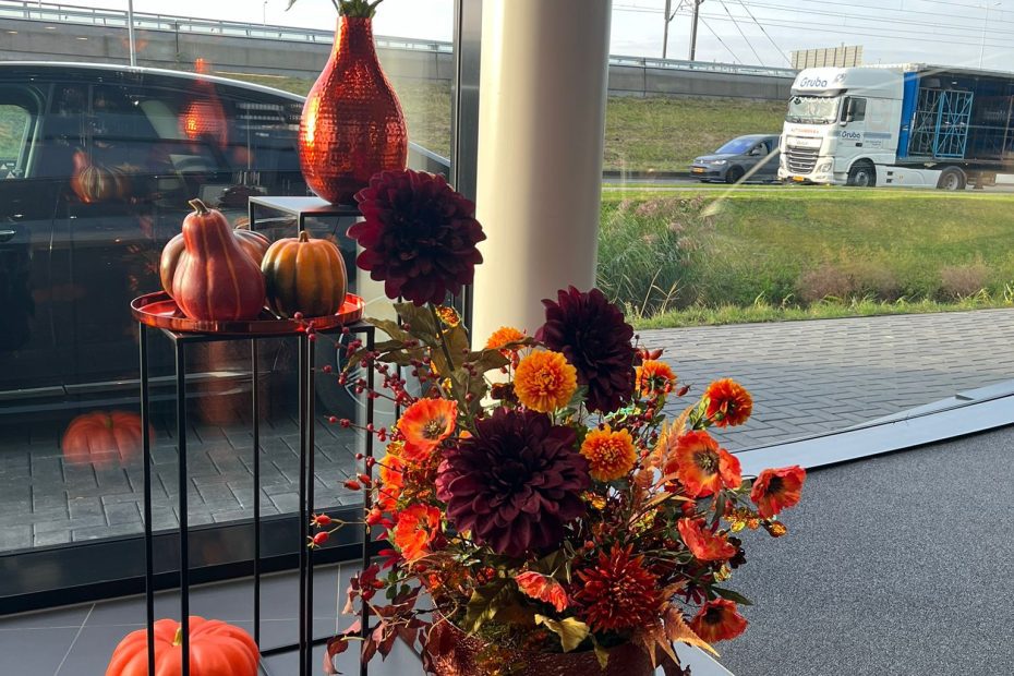 In de showroom wordt de herfst INSTYLE gevierd met prachtige decoraties. De glanzende koperkleurige potten en vazen vullen de ruimte met warmte en klasse, terwijl de zijden bloemen en pompoenen zorgen voor een speels contrast met de strakke lijnen van de auto. Dit unieke herfstconcept benadrukt hoe belangrijk het is om beleving in uw showroom te brengen. Een fijne sfeer in warme herfstkleuren.