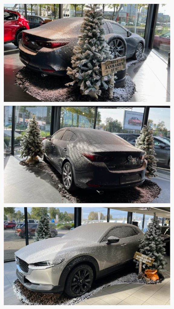 Tijdens de styling brengen we imitatiesneeuw, en decoraties aan op en rond de auto. We letten op detail, balans en sfeer om een aantrekkelijke winterpresentatie te creƫren die direct de aandacht trekt.